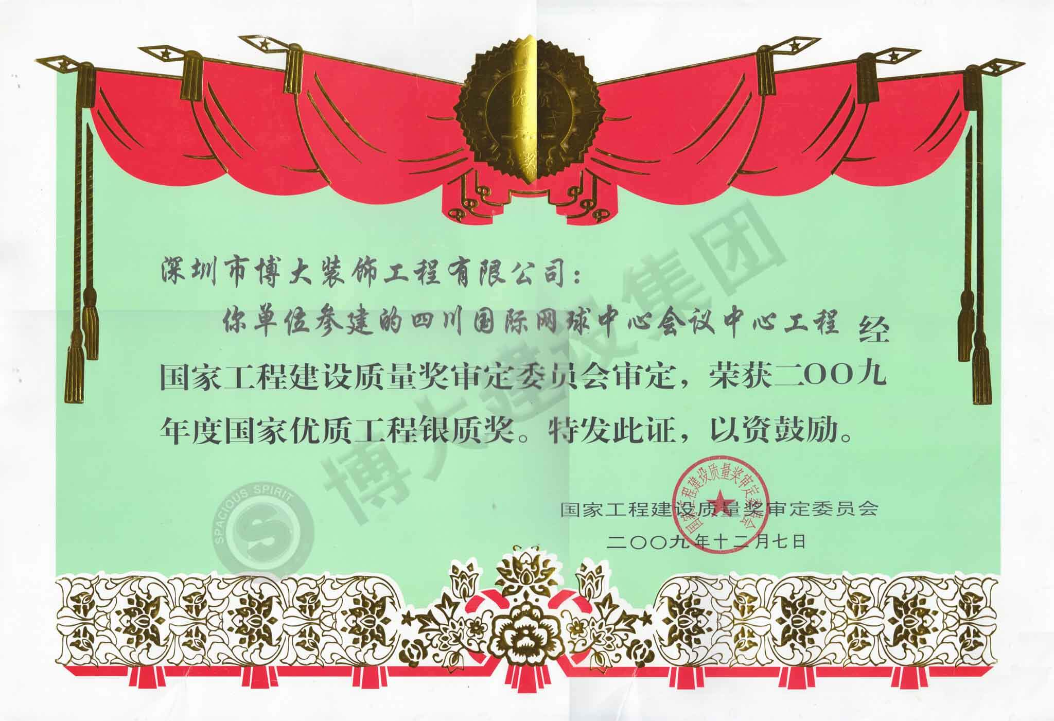國家年度優質工程銀質獎(四川國際網球中心會議中心工程)